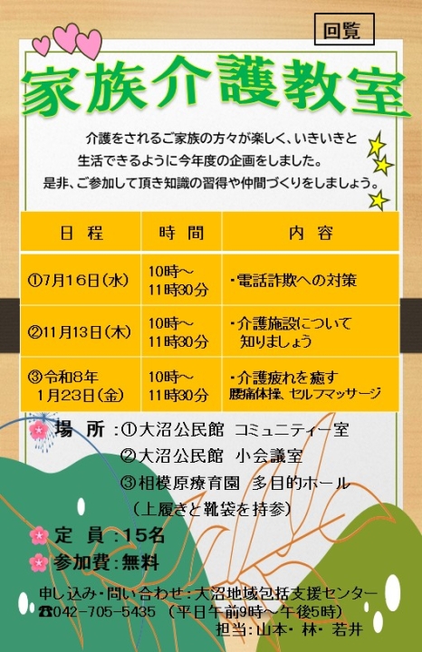 (生活支援ステーションじょんのび管理者・看護師)令和7年度の家族介護教室のご案内です。